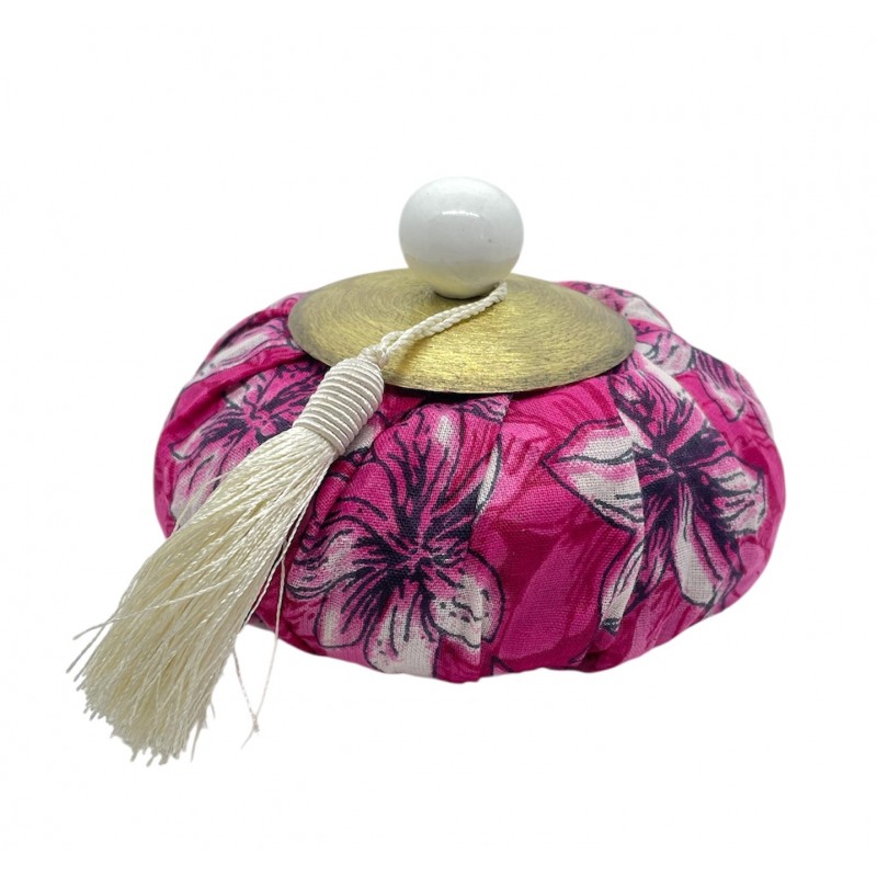 Dans un tissu de qualité suivant les tendances déco, agrémenté d’un ornement en métal travaillé et rehaussé d’une perle, l'aumônière Autour du Parfum trouvera rapidement sa place dans la maison.
